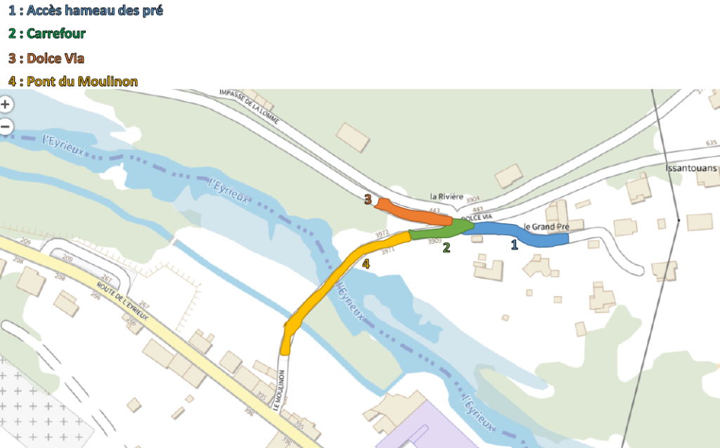· Zone 2 : impact sur le carrefour côté pont et entrée du hameau des Prés (1 semaine)